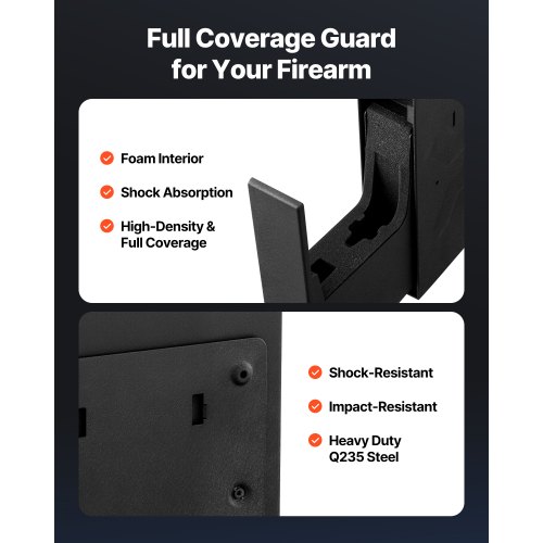Το κουτί όπλου είναι κατασκευασμένο από παχύ μέταλλο με ανθεκτική κατά των παραβιάσεων σχεδίαση για αποφυγή εισβολών και αποτροπή πρόσβασης παιδιών στα όπλα. Ο αφρός υψηλής πυκνότητας προστατεύει το όπλο σας από γρατσουνιές και ζημιές από κραδασμούς.