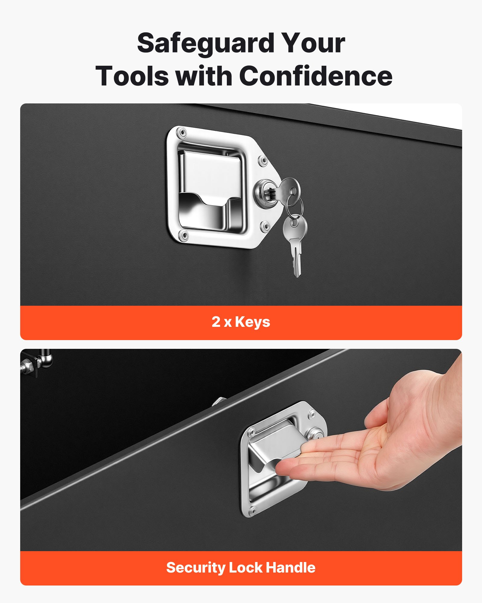 Αυτό το κιβώτιο εργαλείων για ρυμουλκούμενες τρέιλερ διαθέτει ενσωματωμένη κλειδαριά για αποτροπή διαρρήξεων και μείωση των κραδασμών κατά τη μεταφορά. Περιλαμβάνονται δύο αφιερωμένα κλειδιά για πρόσθετη ηρεμία. Τα προσωπικά σας αντικείμενα παραμένουν προστατευμένα από την κλοπή.