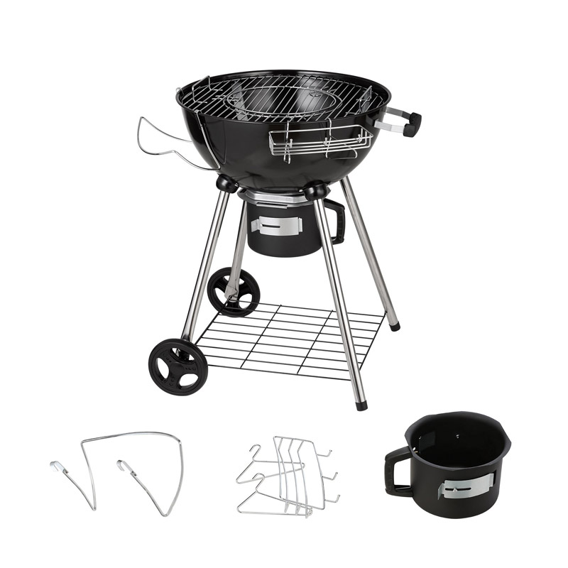 Με τη βάση για το καπάκι και τη σχάρα με γάντζο, μπορείτε να αποφύγετε να τοποθετήσετε το καπάκι στο έδαφος και να επεκτείνετε την επιφάνεια ψησίματος και να κρατάτε όλα τα υλικά και τα καρυκεύματα κοντά σας. Οι ανθεκτικοί τροχοί σας επιτρέπουν να μετακινείτε γρήγορα την ψησταριά και το κάτω ράφι διευρύνει τον αποθηκευτικό σας χώρο.