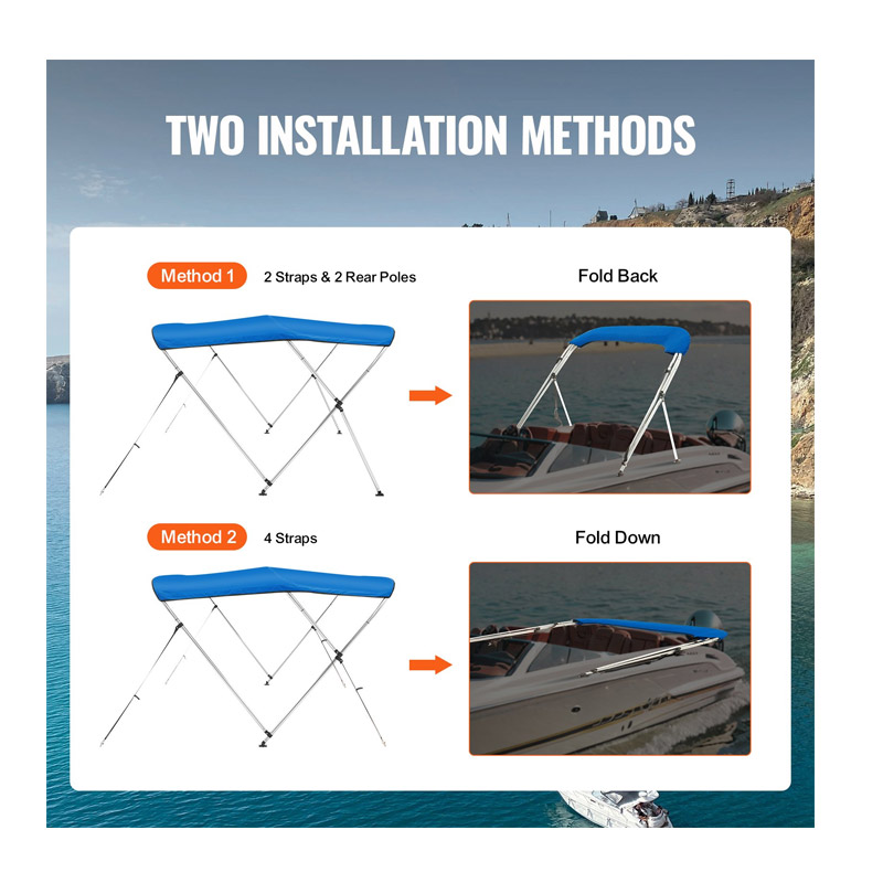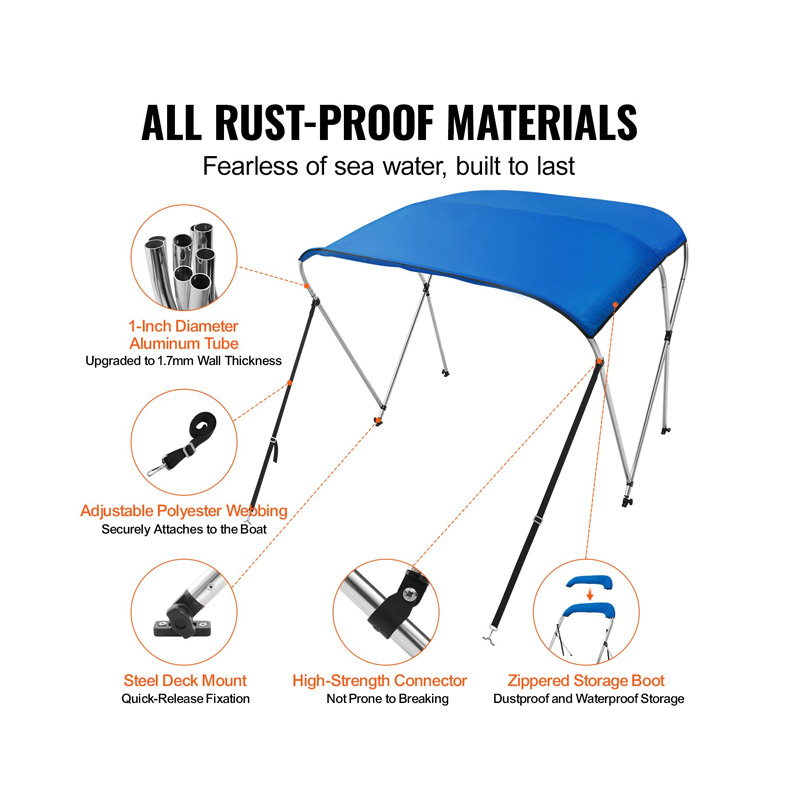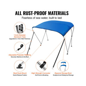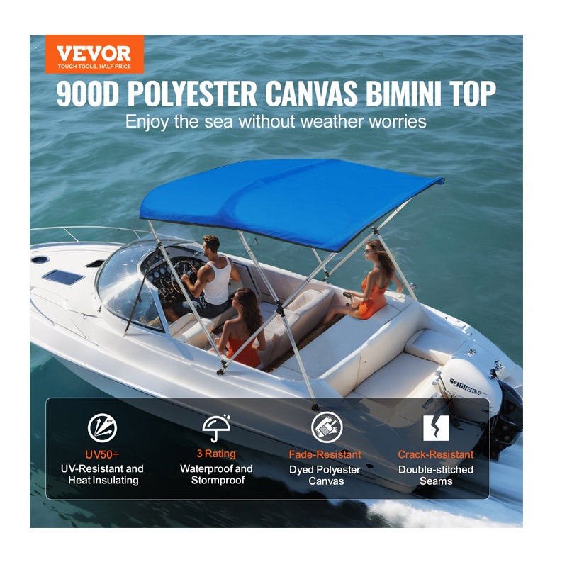 Η τέντα σκάφους, από την εταιρία VEVOR, διαθέτει ισχυρούς σωλήνες από κράμα αλουμινίου και συνδέσμους που στερεώνουν με ασφάλεια την τέντα, αποτρέποντας το κούνημα ή το δίπλωμα. Η αεροδυναμική σχεδίαση ελαχιστοποιεί την αντίσταση στον αέρα, επιτρέποντας ασφαλές ταξίδι. Πολυεστερικός θόλος με προστασία UV50+, αδιαβροχοποίηση και αντοχή στη διείσδυση. Ενισχυμένος με ποιοτική διαδικασία βαφής για σταθερότητα χρώματος και διπλή ραφή για αυξημένη αντοχή στο σχίσιμο. Έχει σχεδιαστεί για να αντέχει έως και 3-4 μποφόρ ανέμου.