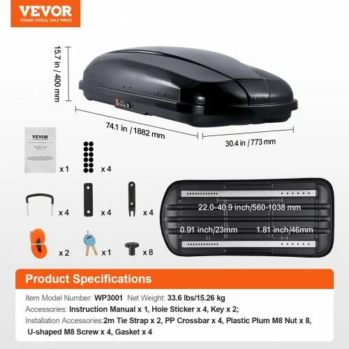 Ανακαλύψτε την ιδανική λύση για την αποθήκευση των αποσκευών σας με το VEVOR Φορέα Αποσκευών Οροφής. Κατασκευασμένο από ανθεκτικό υλικό ABS, αυτό το κουτί αποθήκευσης προσφέρει 14 κυβικά πόδια (370 λίτρα) χωρητικότητας, ιδανικό για SUV και αυτοκίνητα.