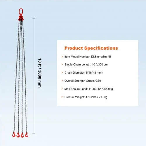 Ανακαλύψτε την ανθεκτική και αξιόπιστη αλυσίδα ανύψωσης VEVOR με 4 σκέλη, ιδανική για βαριές ανυψώσεις έως 11000 lbs (5000 kg). Κατασκευασμένη από υλικό υψηλής αντοχής G80, αυτή η αλυσίδα προσφέρει ασφάλεια και αξιοπιστία σε κάθε χρήση.
