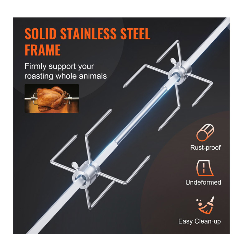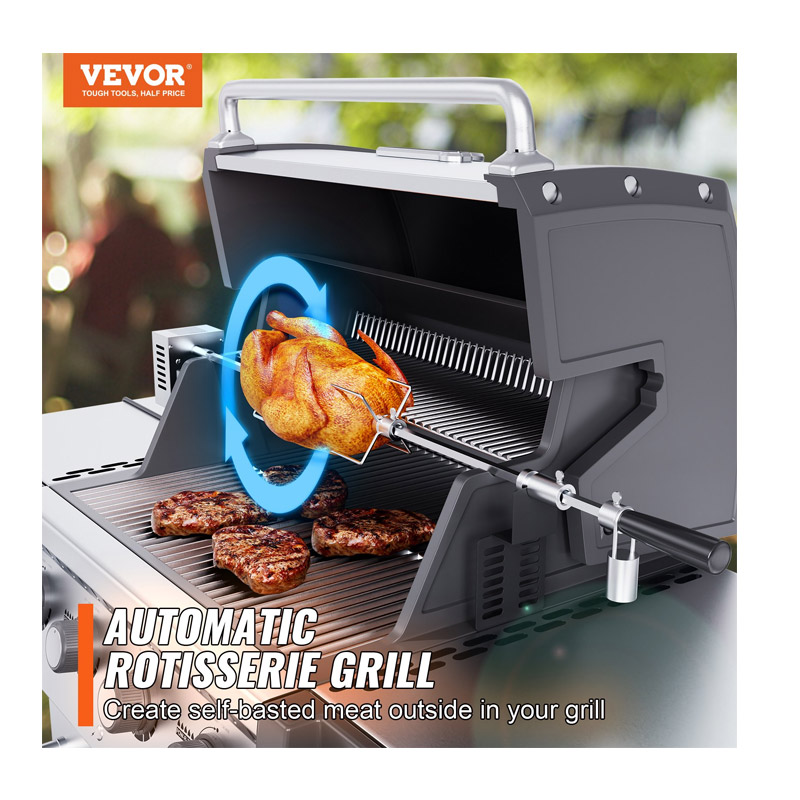 Η σούβλα ψησταριάς, από την εταιρία VEVOR, είναι κατασκευασμένη από μασίφ ανοξείδωτο ατσάλι, αντέχει σε υψηλές θερμοκρασίες και είναι εύκολο να συντηρηθεί και να καθαριστεί. Διαθέτει έναν ισχυρό κινητήρα 9 W, επιτρέποντας στη ράβδο σούβλας να περιστρέφεται. Ιδανική για ψήσιμο αρνιού, κοτόπουλου, πάπιας, ζαμπόν και γαλοπούλας.