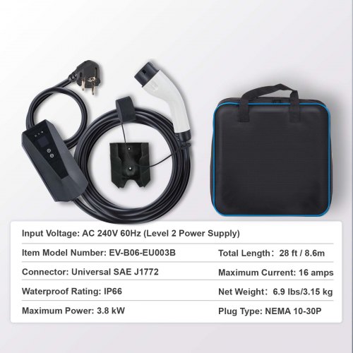 Αποκτήστε τον φορητό φορτιστή VEVOR και απολαύστε την άνεση της γρήγορης και ασφαλούς φόρτισης όπου κι αν βρίσκεστε. Περιλαμβάνει τσάντα μεταφοράς και γάντζο καλωδίου για εύκολη αποθήκευση και μεταφορά.