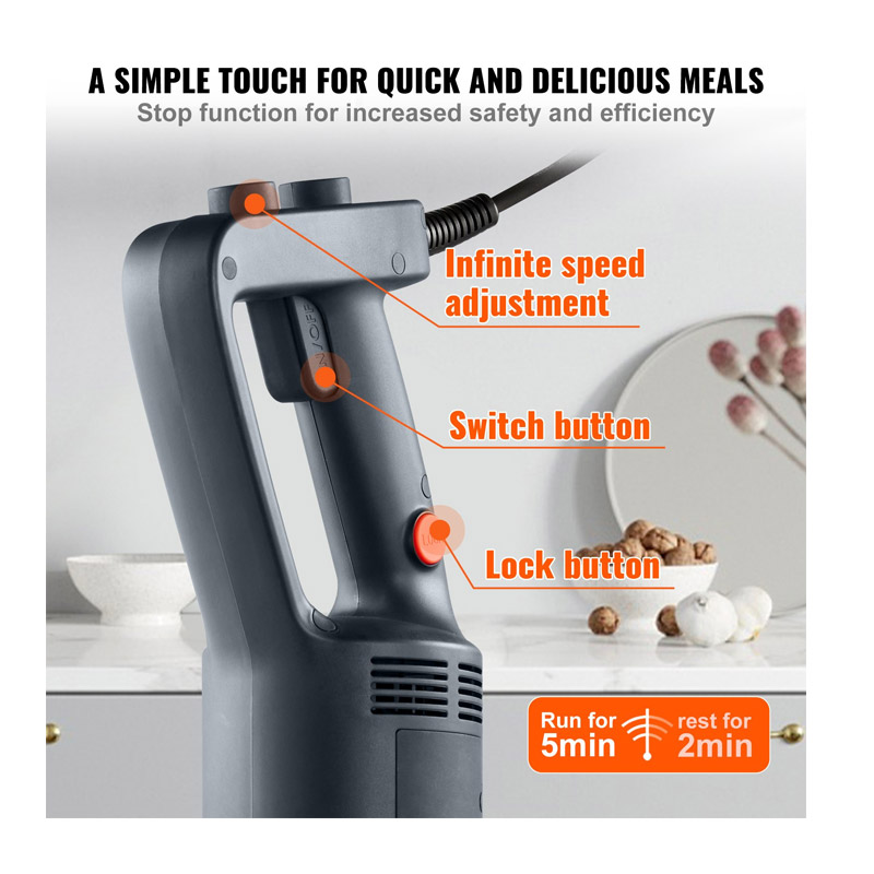 Ο αποσπώμενος σχεδιασμός επιτρέπει την εύκολη περιστροφή για τη συναρμολόγηση ή την αποσυναρμολόγηση της λαβής, της ανάμειξης του ποδιού και άλλων εξαρτημάτων. Διαθέτει άνετη λαβή από καουτσούκ, εξασφαλίζοντας ασφαλή και ελεγχόμενη λειτουργία. Ο σχεδιασμός του κουμπιού κλειδώματος επιτρέπει την παρατεταμένη χρήση. Η προστασία υπερθέρμανσης διασφαλίζει ότι το μηχάνημα κρυώνει μετά από συνεχή χρήση – λειτουργήστε για 5 λεπτά και ξεκουραστείτε για 2, εξασφαλίζοντας ασφάλεια. Ο έλεγχος μεταβλητής ταχύτητας παρέχει μια απελευθερωτική εμπειρία ανάμειξης.