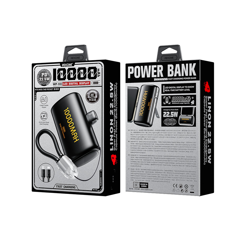 Το WEKOME WP-113 είναι ένα compact power bank με χωρητικότητα 10.000mAh, σχεδιασμένο να προσφέρει αξιόπιστη και ταχύτατη φόρτιση όπου κι αν βρίσκεστε. Με μέγιστη ισχύ εξόδου 22.5W, μπορεί να φορτίσει τις συσκευές σας έως και 3 φορές γρηγορότερα σε σύγκριση με τους συμβατικούς φορτιστές.