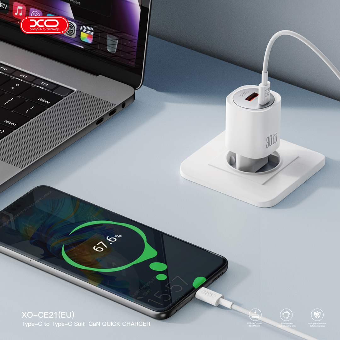 XO Wall Charger CE21 (1xUSB-A, 1x USB-C) 30W – Φορτιστής Ταχείας Φόρτισης Τοίχου Ταξιδίου με καλώδιο USB-C / USB-C