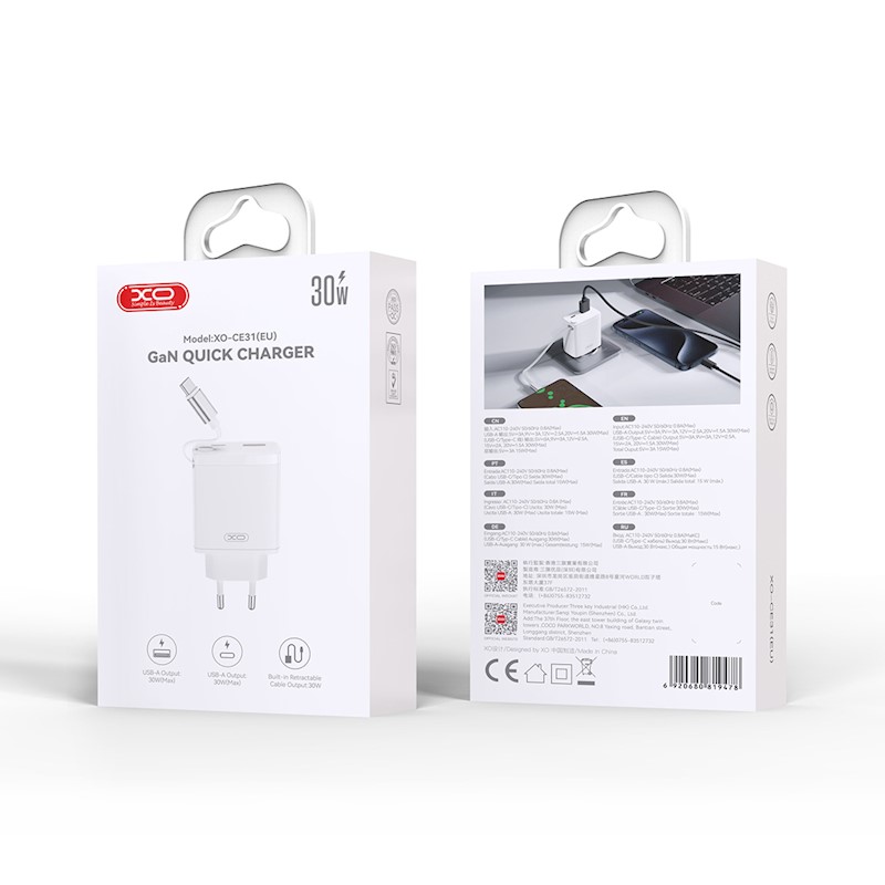 Ο φορτιστής τοίχου XO CE31 είναι μια πρακτική και ισχυρή λύση φόρτισης, ιδανική για καθημερινή χρήση και ταξίδια. Με συνολική ισχύ 30W, υποστηρίζει ταχεία φόρτιση μέσω των θυρών USB-C PD και USB-A QC, ενώ διαθέτει ενσωματωμένο αναδιπλούμενο καλώδιο USB-C για επιπλέον ευκολία.