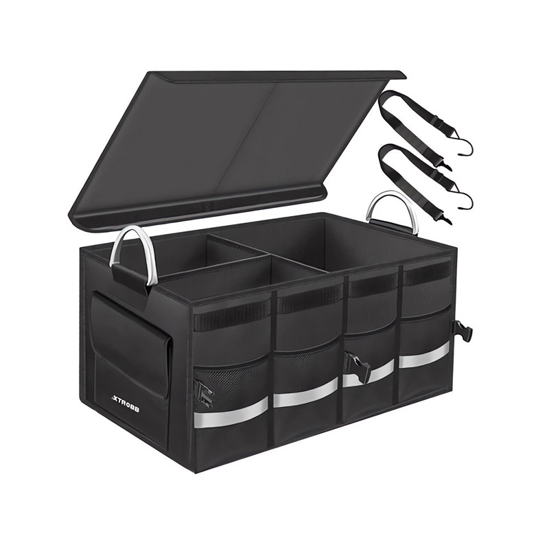 Η θήκη οργάνωσης πορτ μπαγκάζ αυτοκινήτου, από την εταιρία Xtrobb, είναι κατασκευασμένη από ισχυρό υλικό Oxford 600D. Ιδανική για να κρατάτε τα πράγματα που μεταφέρονται στο πορτ μπαγκάζ σε ένα μέρος με τάξη. Διαθέτει σκληρυμένο πάτο, καπάκι και μεταλλικές λαβές μεταφοράς. Έχει έναν μεγάλο θάλαμο που μπορεί να χωριστεί σε τρεις μικρότερους χάρη στα διαμερίσματα. Επιπλέον, έχει τέσσερις διχτυωτές τσέπες στο μπροστινό μέρος και μία τσέπη κλειστή με Velcro στο πλάι.