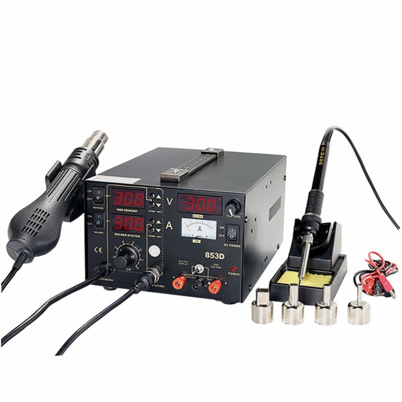 Αντιστατικός σταθμός κόλλησης και θερμού αέρα, ρυθμιζόμενη θερμοκρασία, ψηφιακές ενδείξεις, ενσωματώνει ρυθμιζόμενο τροφοδοτικό 0-15V DC 1A με προστασία. Ιδανικό για εργαστήρια επισκευής κινητών τηλεφώνων και laptop