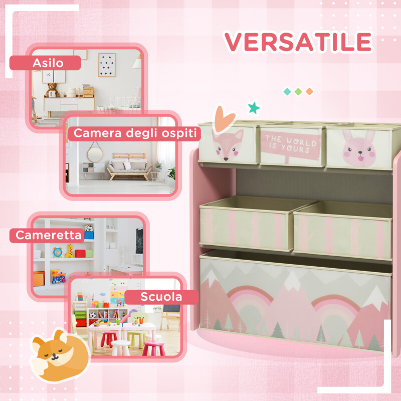 ZONEKIZ Παιδικό ράφι παιχνιδιών με 6 αφαιρούμενα υφασμάτινα δοχεία, 63x30x66cm, Ροζ 311-059V80PK